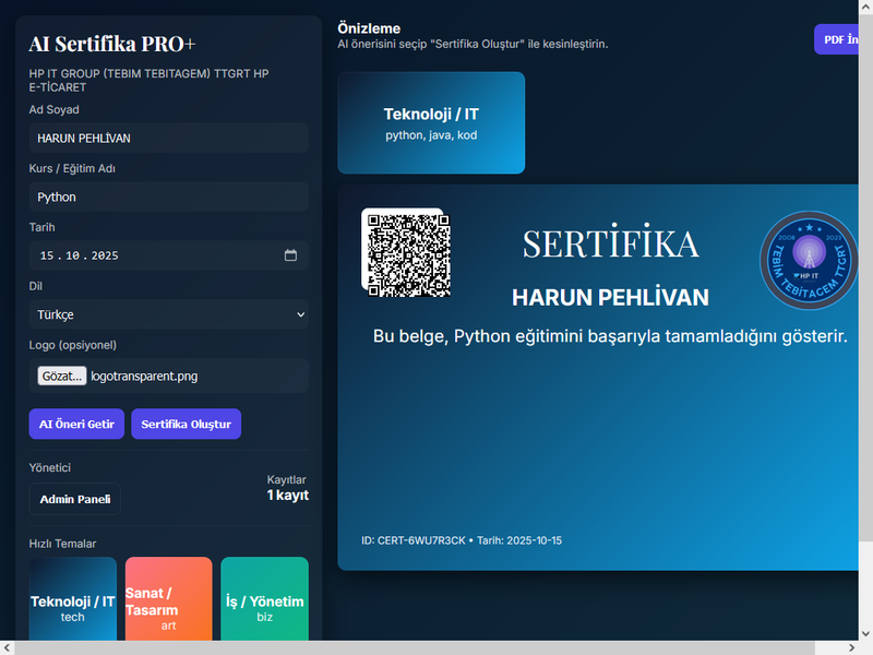 Akıllı Sertifika Yönetimi Dijital Dünyada Güvencesiyle” Kısa Açıklama: Kullanıcıların, kurumların veya eğitim platformlarının sertifika süreçlerini dijitalleştirip otomatikleştirmelerine olanak veren gelişmiş sertifika yönetim çözümü.